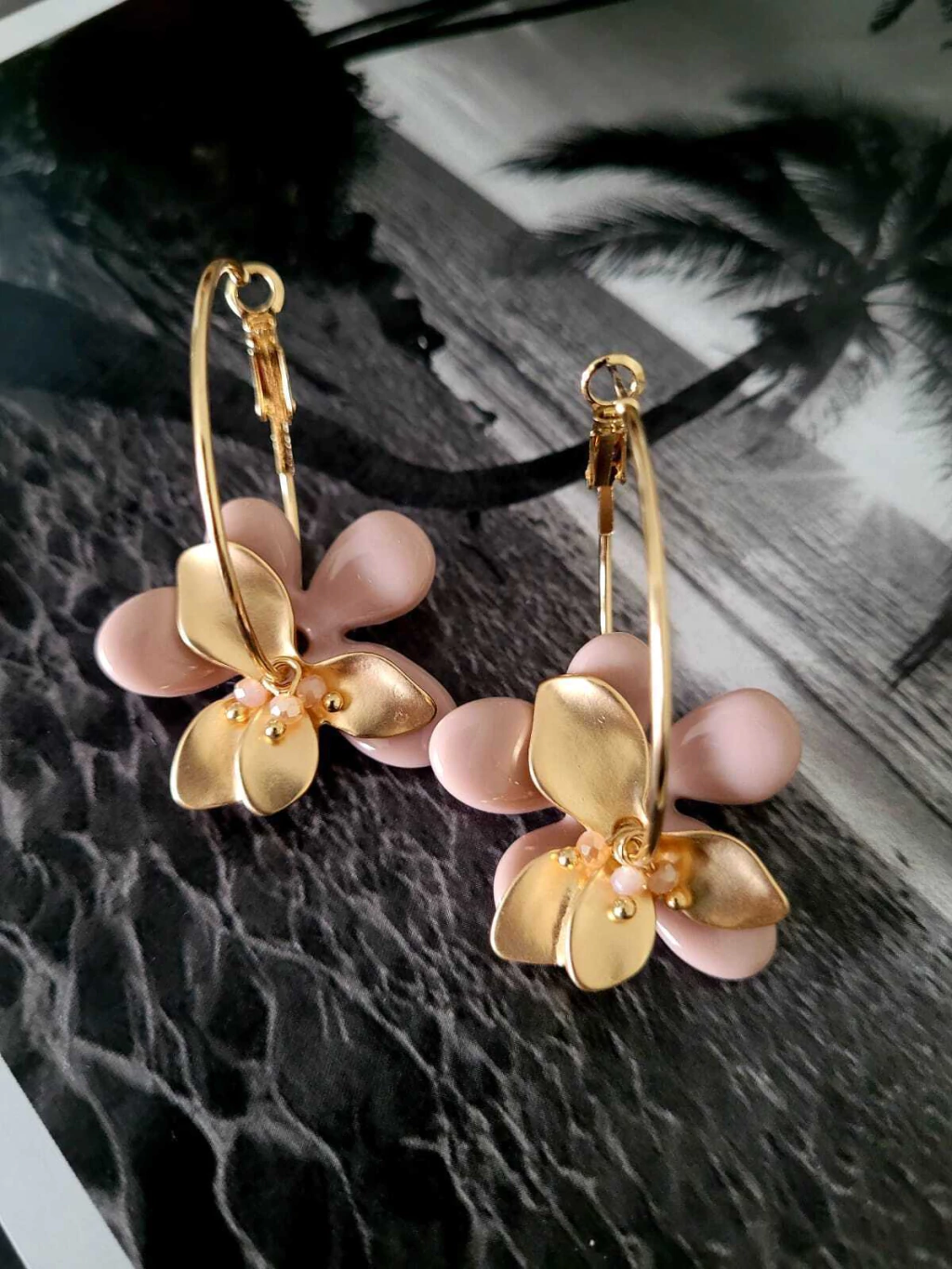 Argollas con dijes de flor de resina italiana y dorado mate .