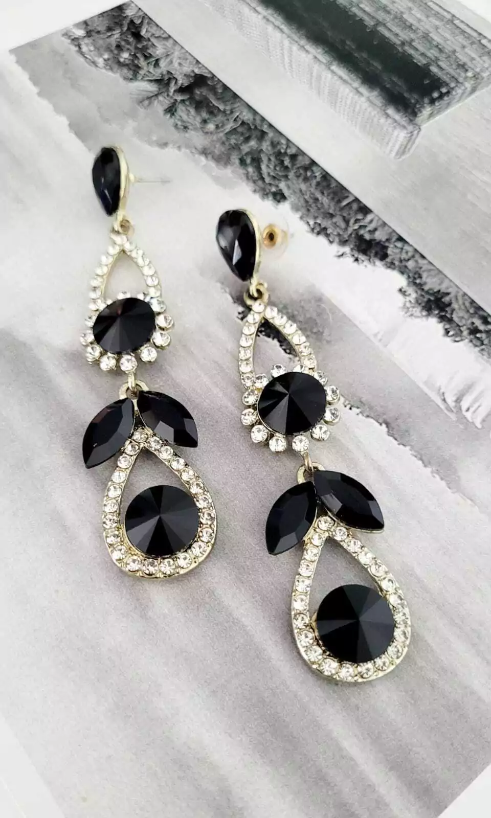 Aros de base dorada con piedras negras y strass cristal. Elegante, atemporal. El detalle que te distingue. Medida: 9 cm