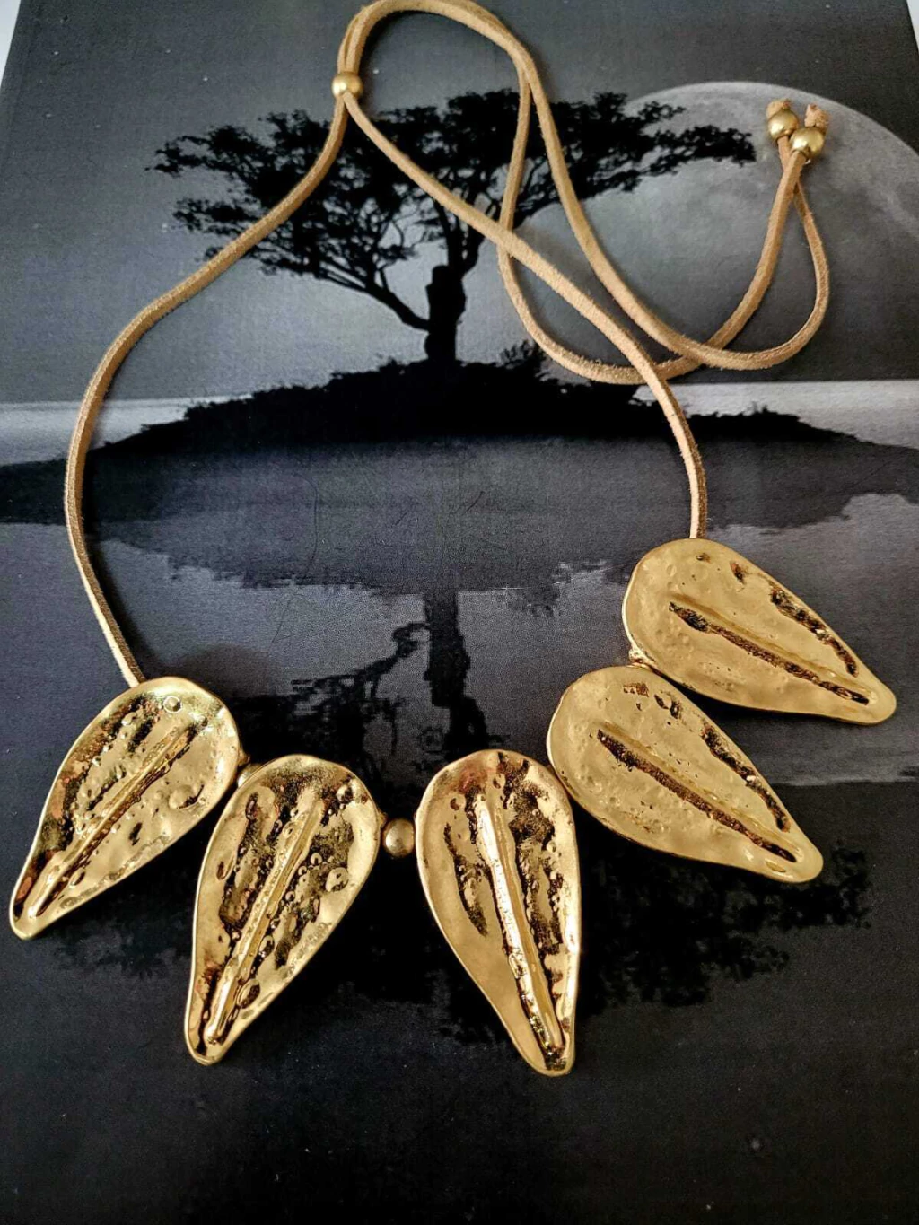 Collar realizado en gamuza y dijes confeccionados en zinc galvanizado electrolaminado dorado mate .