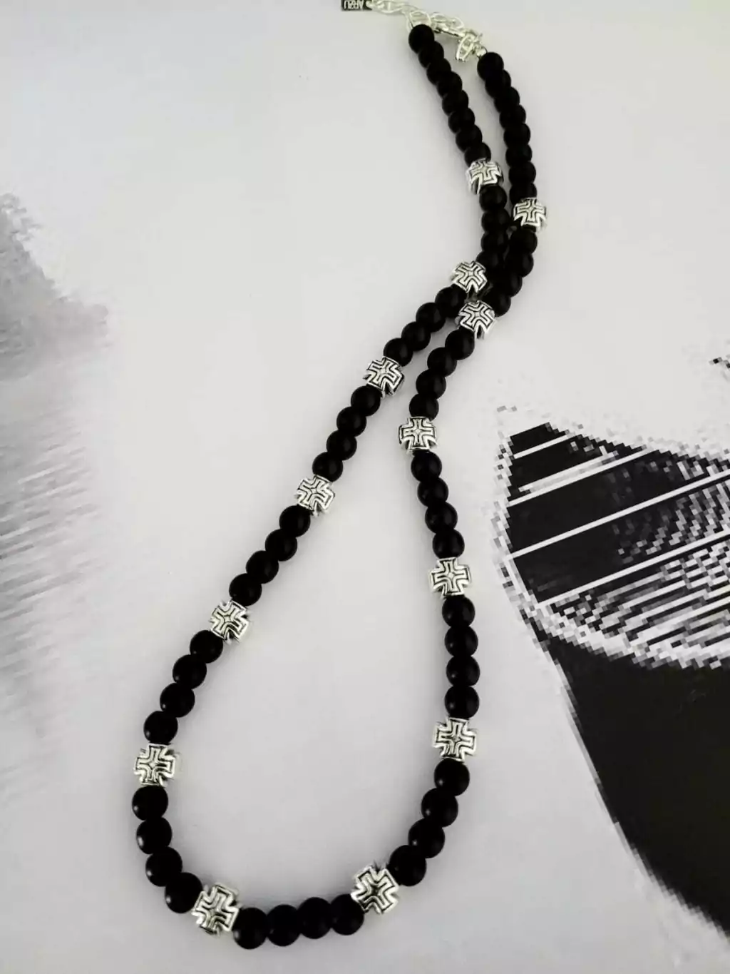Apolo está realizado con piedras Ónix mate y dijes tallados en forma de cruz. Piedras de 6mm.