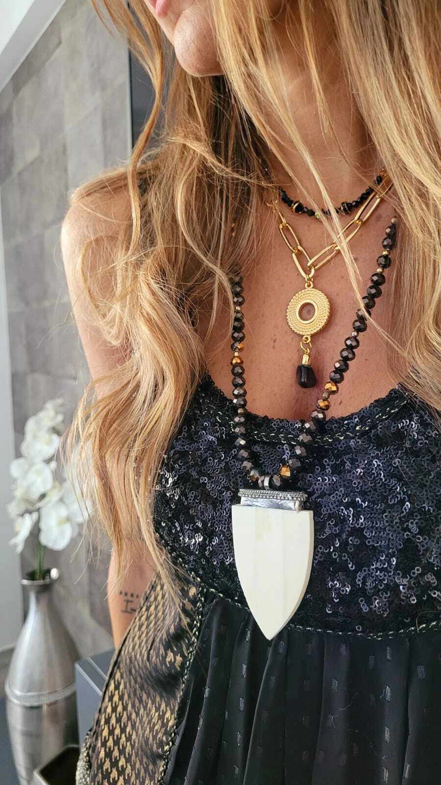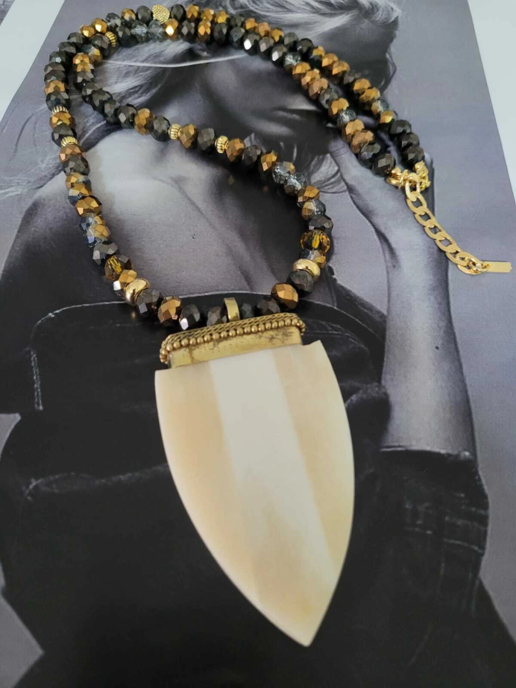 Nuestro collar Astrid está realizado con piedras de cristal y dije de asta con terminación de alpaca.