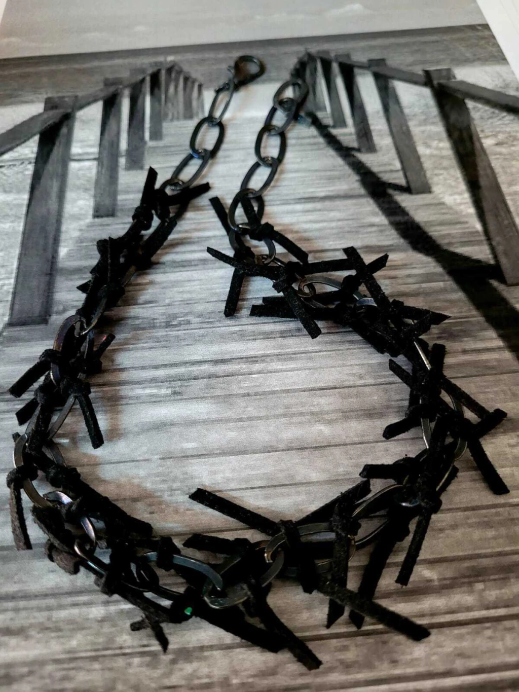 Collar de cadena pavonada y nudos en gamuza.