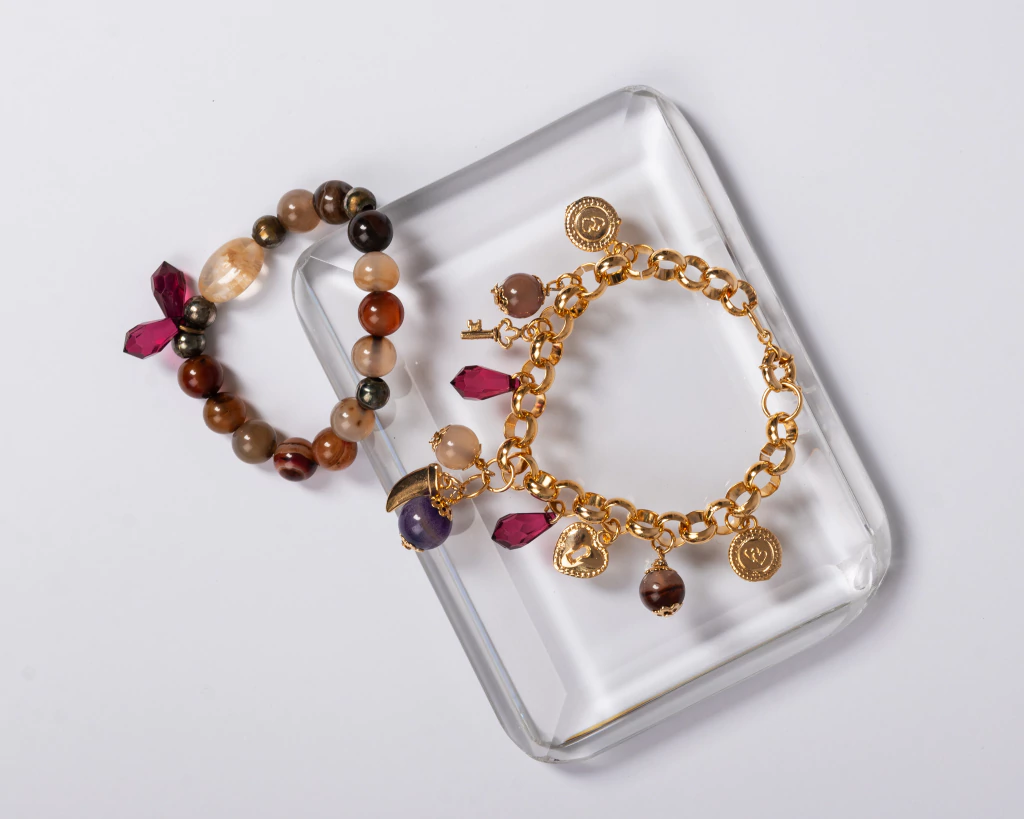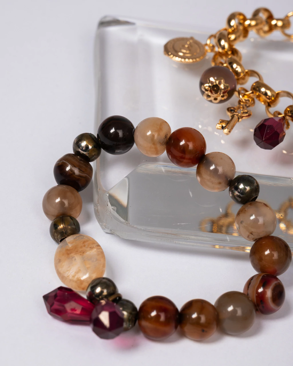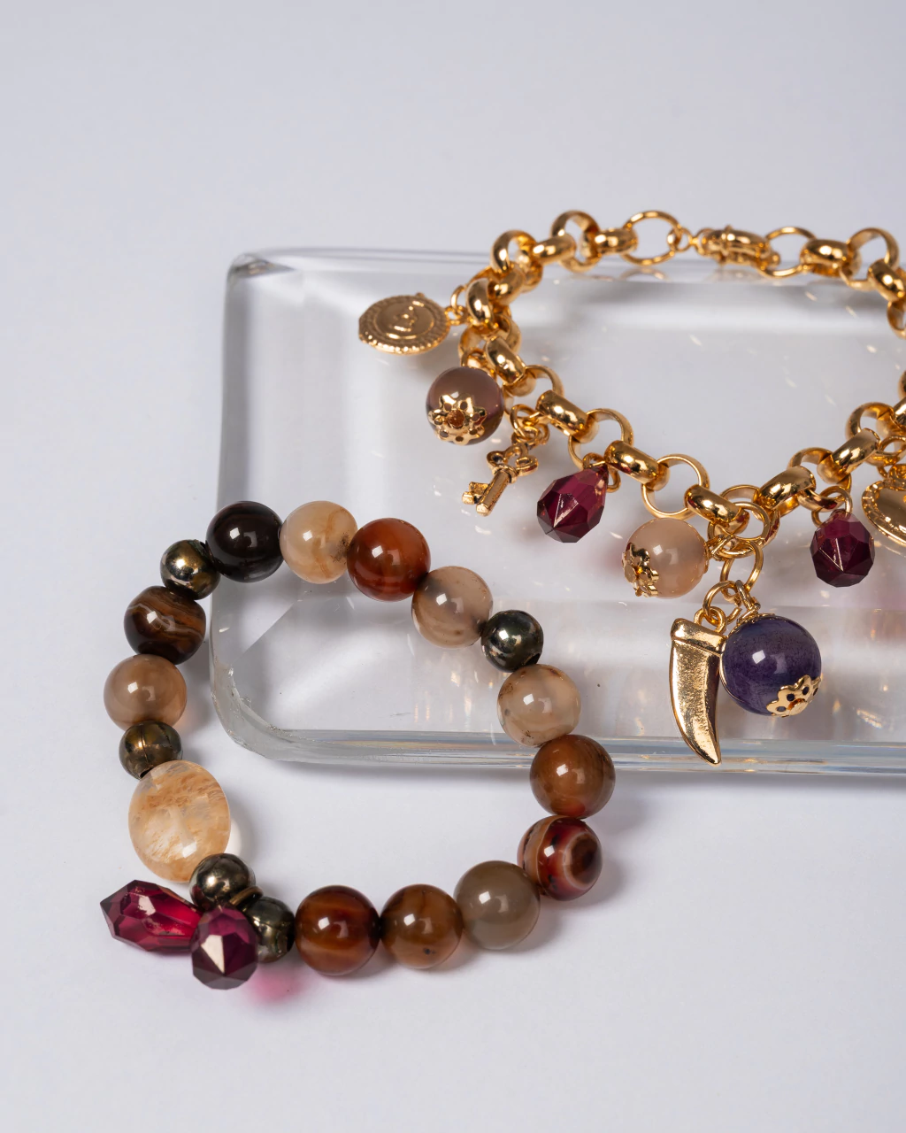 Set de pulseras realízado con piedras naturales Ágatha, Aragonita , caireles dd resina , bronce envejecido, pulsera y dijes bañados en oro 18 k .
