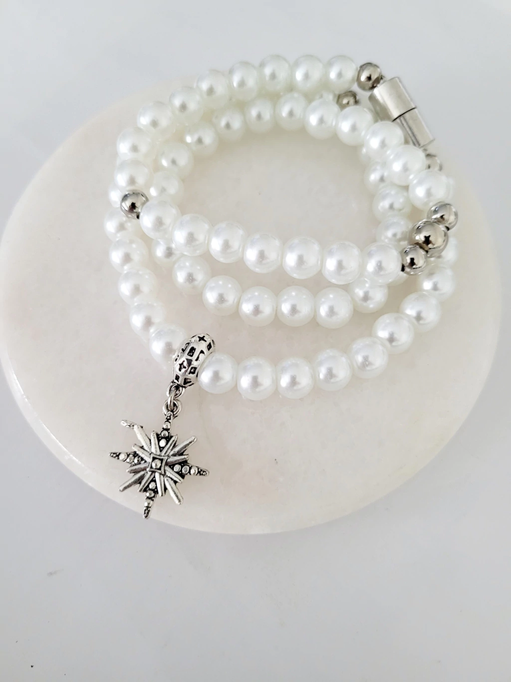 Realizado con perlas blancas , dije de Niquel wood y cierre imantado.