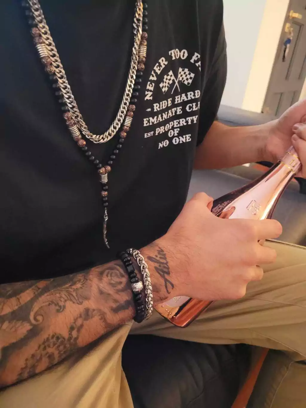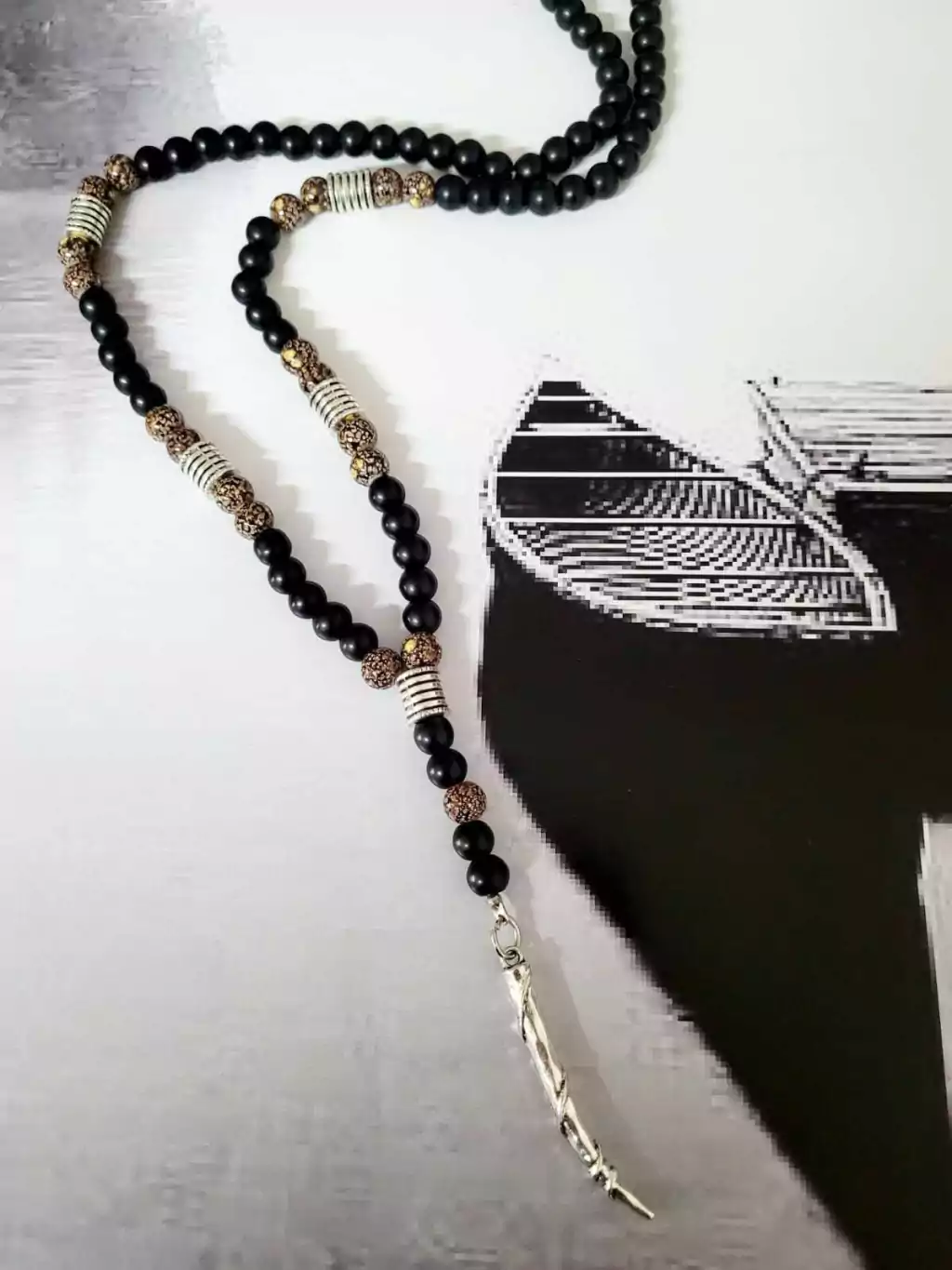Daga está realizado con piedras Ónix semi mate, venturina y detalles en niquel. Piedras de 8 mm. Deje de acero.