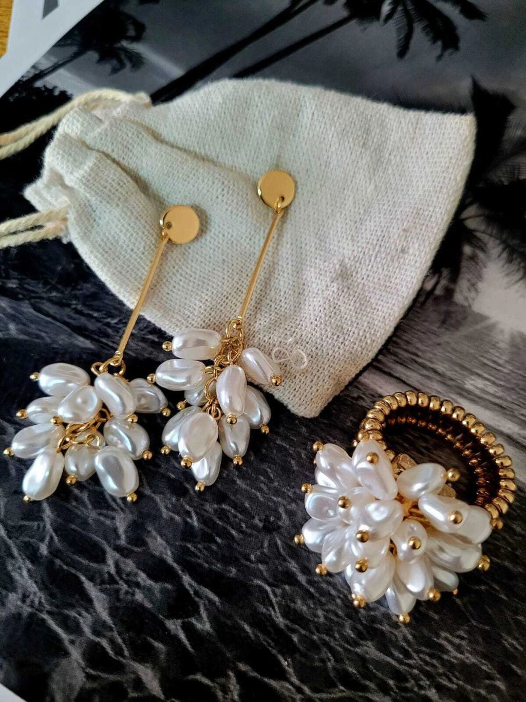 Conjunto de aros y anillo decorado con delicadas perlas en forma de gota.