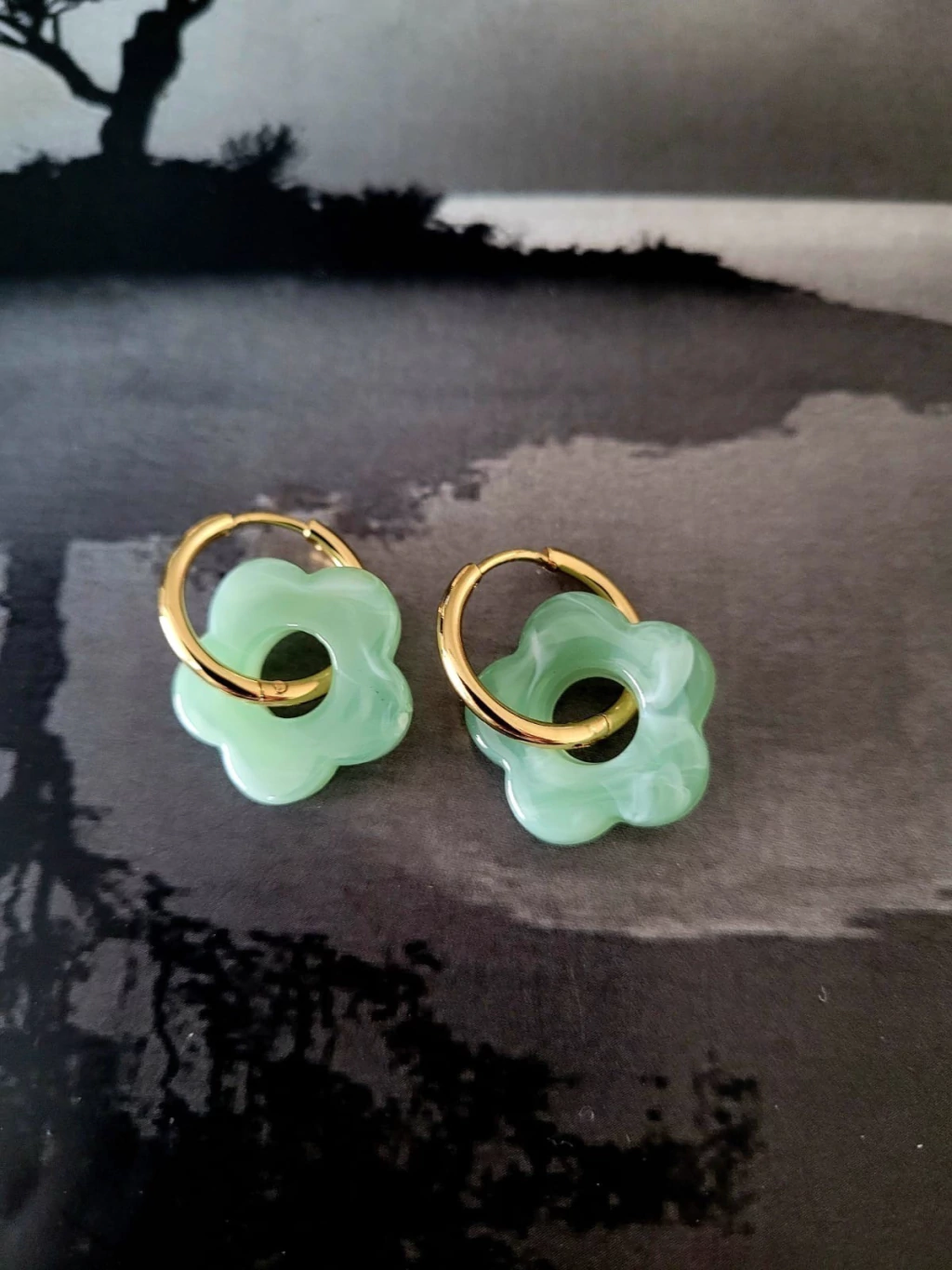 Argolla lisa bañada en oro con dije de resina verde traslúcido . Con posibilidad de usarla sola o con dije .