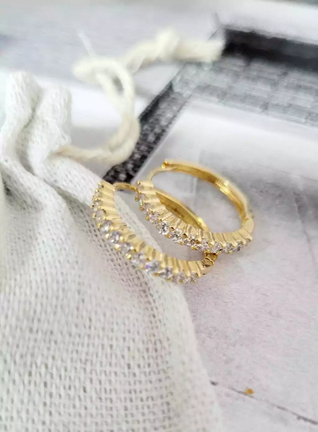 Argollas con micro pavé cristal, bañadas en oro amarillo. Medida: 2 cm de diámetro.