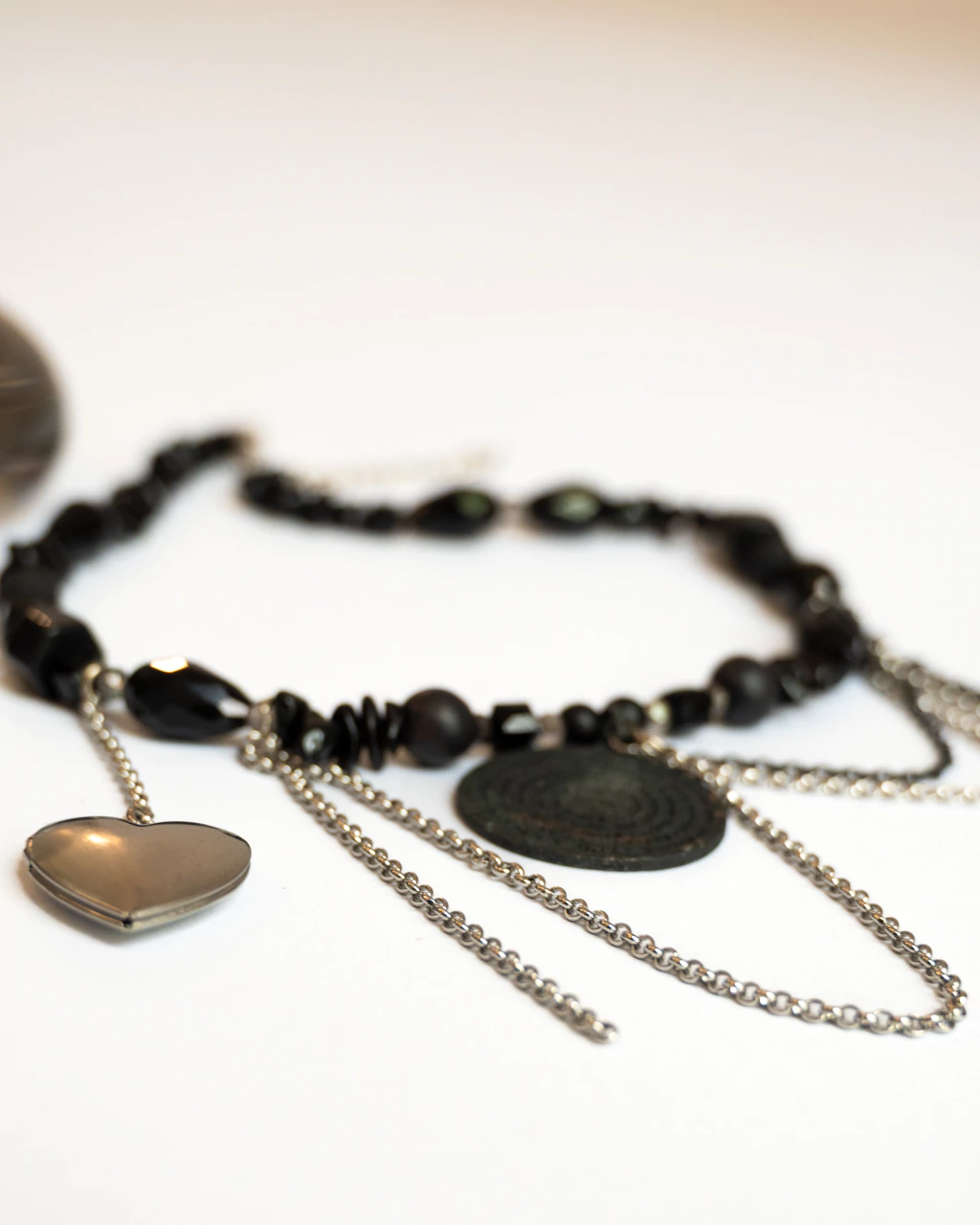 Realizado en cristales negros , piedras Ónix, cadena en acero y pavonado.