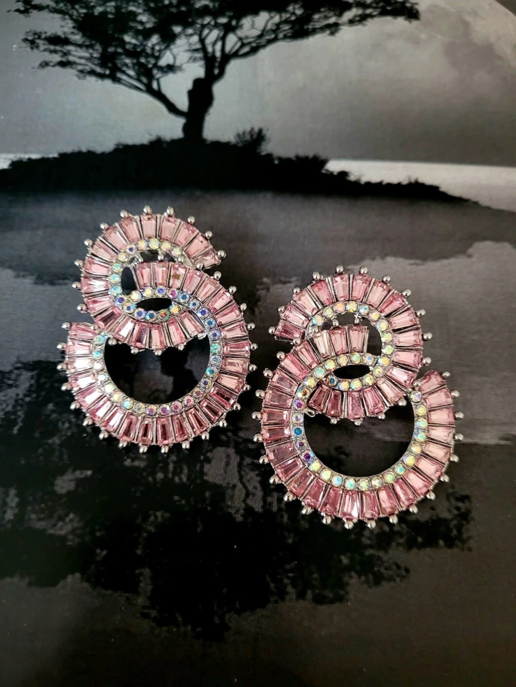 Aros de base plateada con piedras cristal y rosa . Elegantes y protagonistas