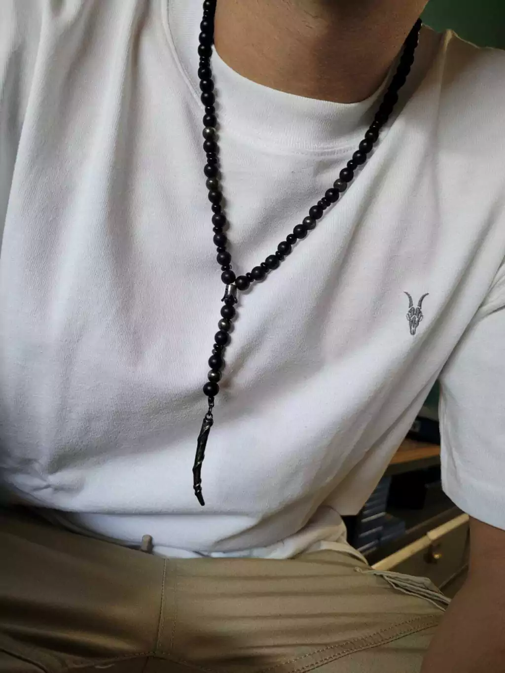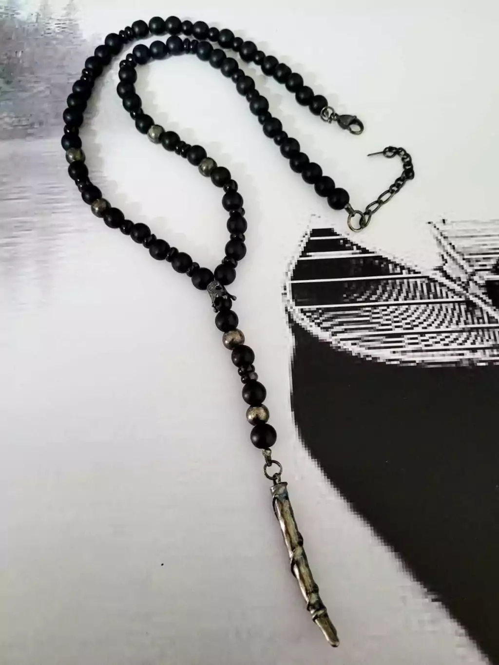 Elga está realizado con Ónix mate, donas de Ónix brillante. , detalles y dije pavonados .