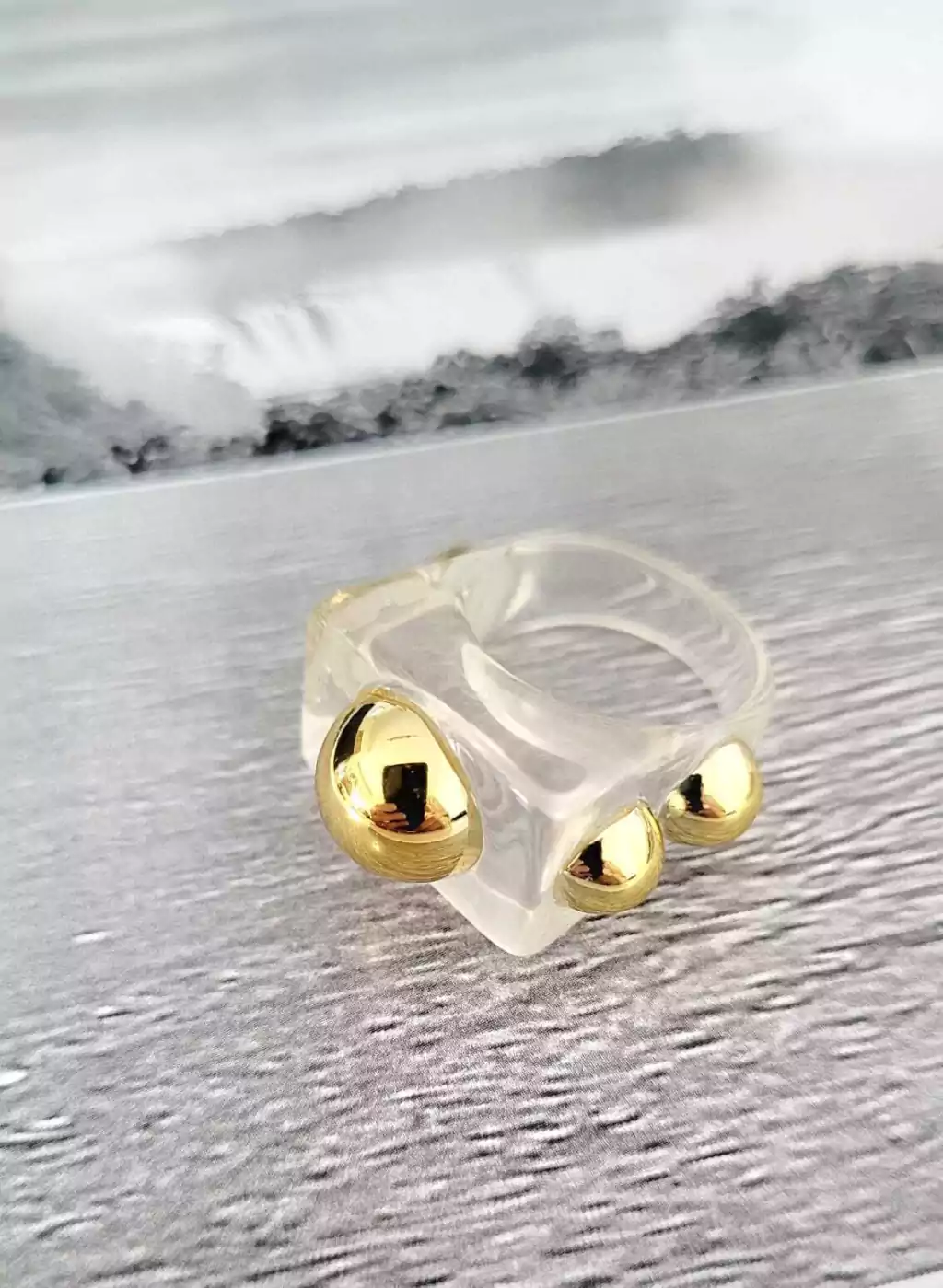 Anillo de diseño actual, de resina cristal con detalles dorados.