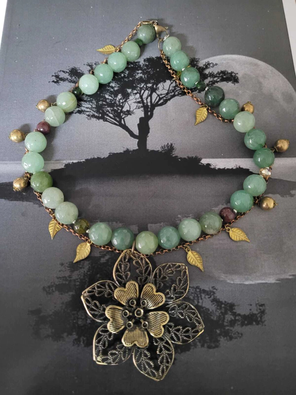 Collar con piedras naturales de cuarzo verde y cadenas con dijes de bronce..