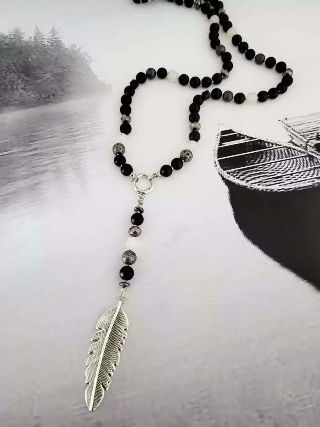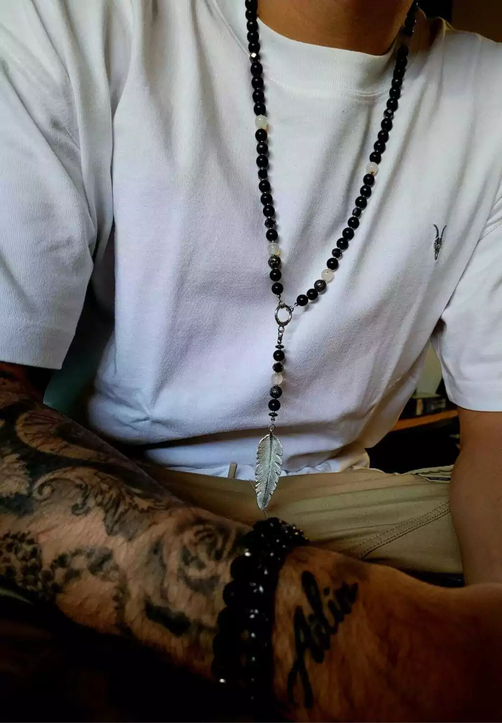 Fermin está realizado con piedras Ónix mate, perla Taitiana , hematites , piedra volcánica, perlas de vidrio y cristales. Piedras de 8 mm Medida: 63 cm + 8 cm