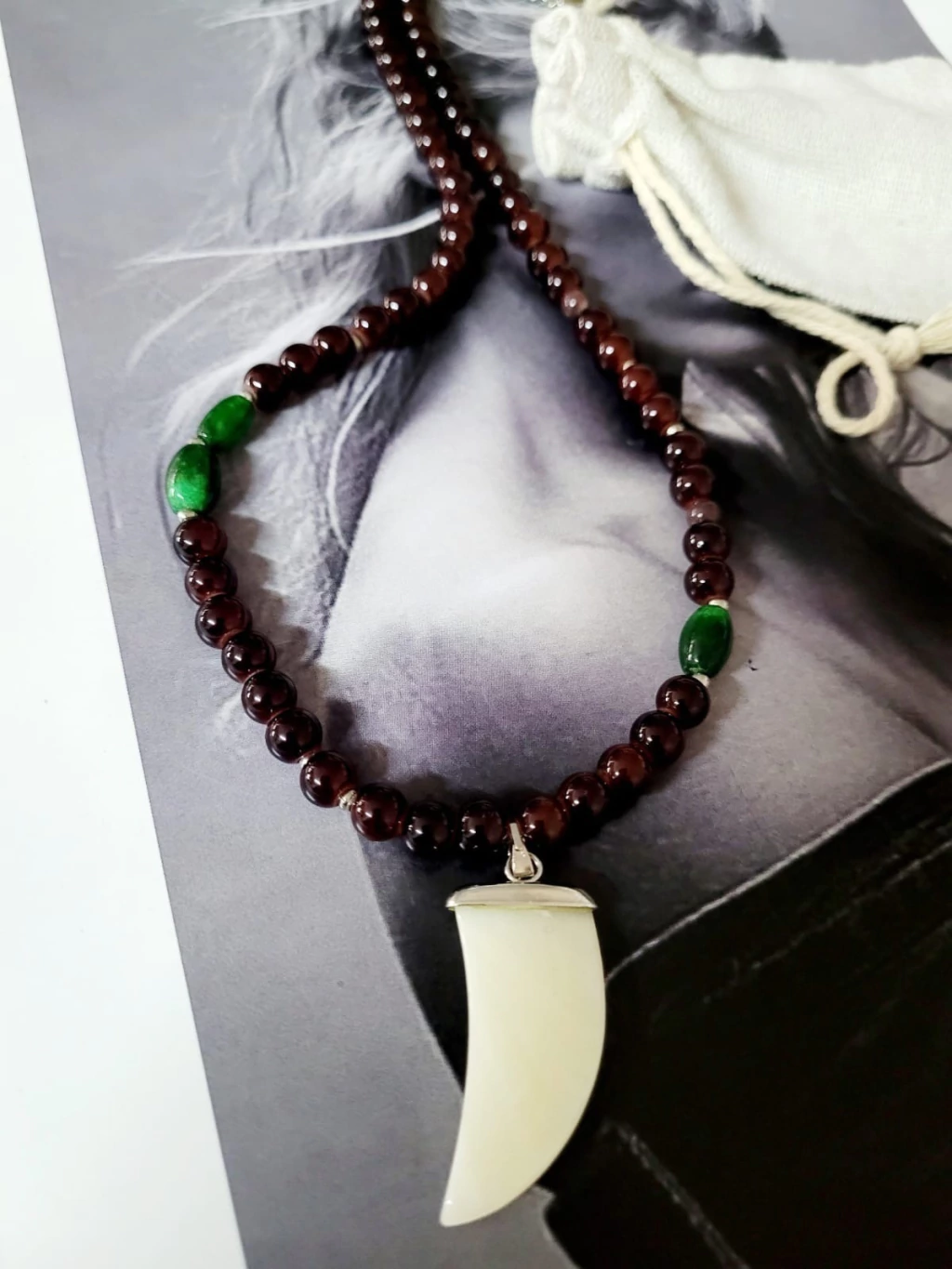 Collar realizado con piedras de vidrio marrón y cuarzo , con dije de nácar.