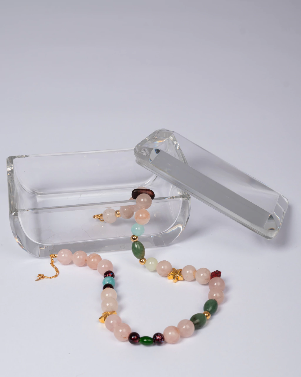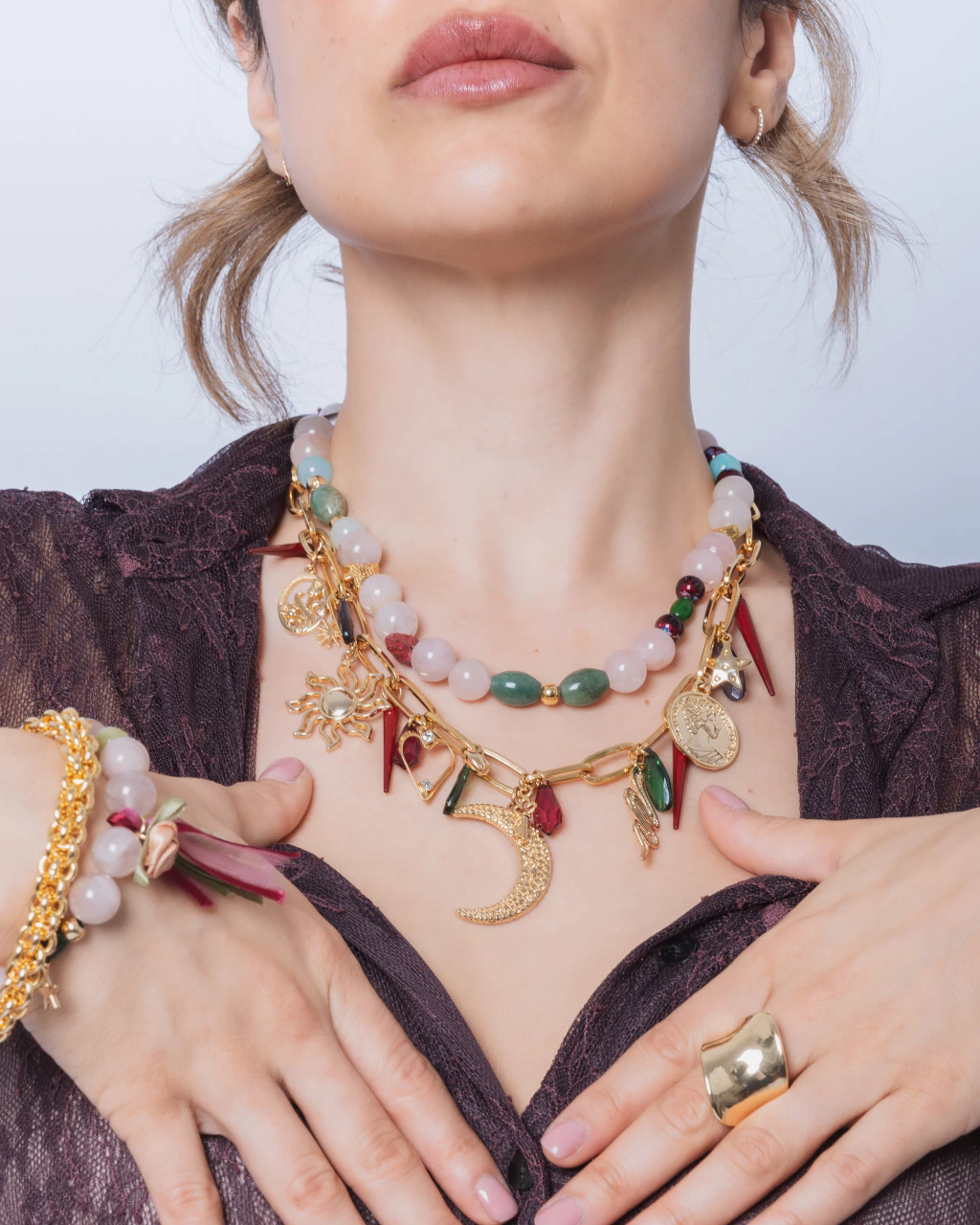 Realizado con piedras naturales de Cuarzo rosa y verde , Aragonita y detalles bañados en oro 18 k