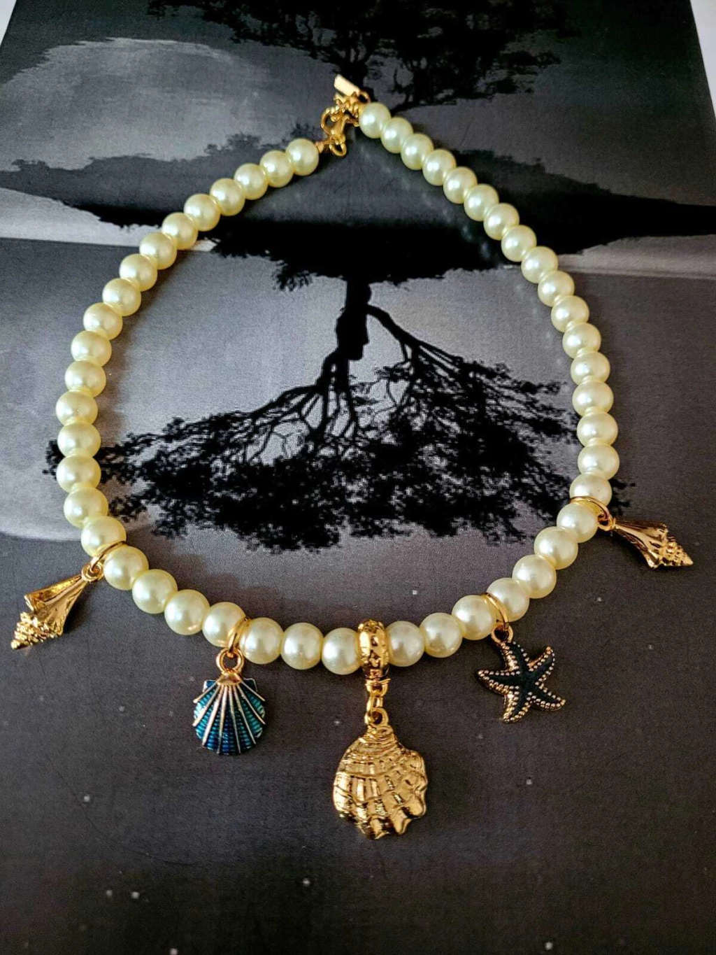 Collar de perlas color natural con dijes bañados en oro y esmaltados.