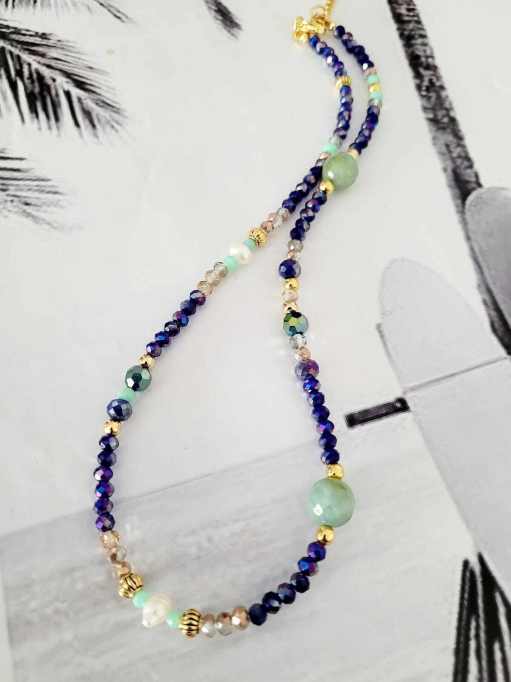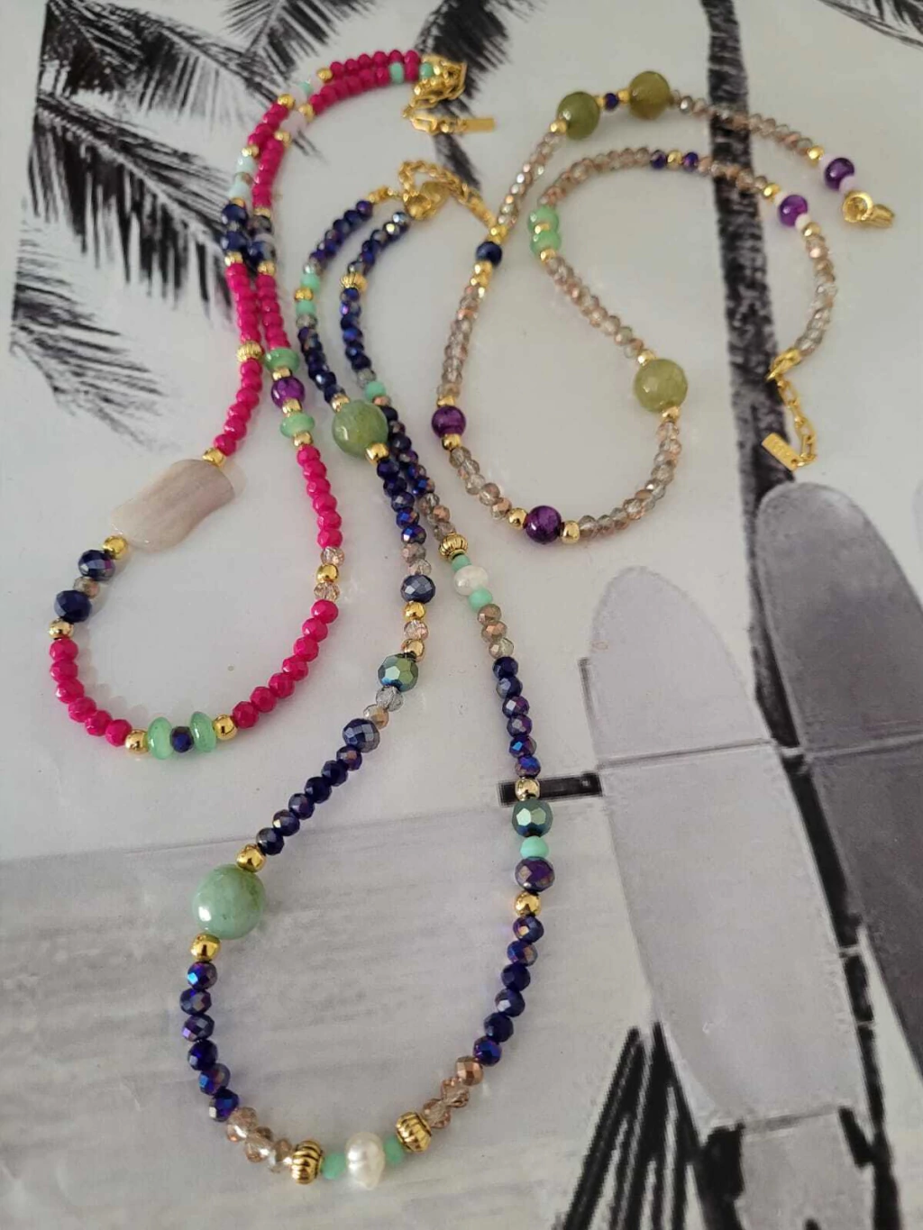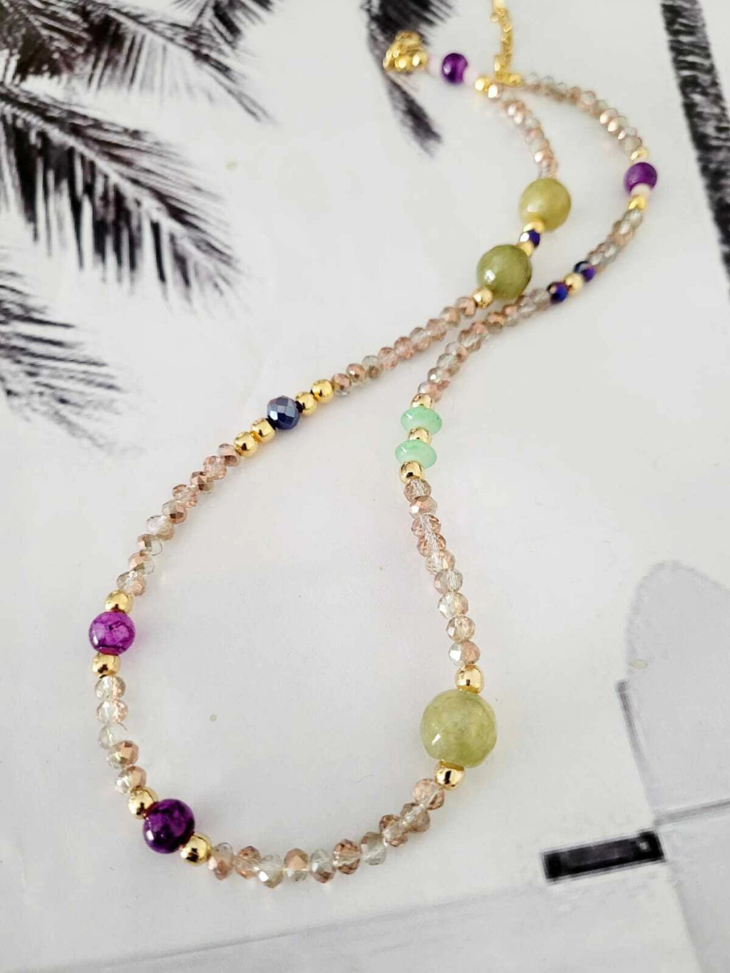 Collar realizado con piedras de cristal en diferentes tonos , cuarzo citrino y jade y detalles bañados en oro.