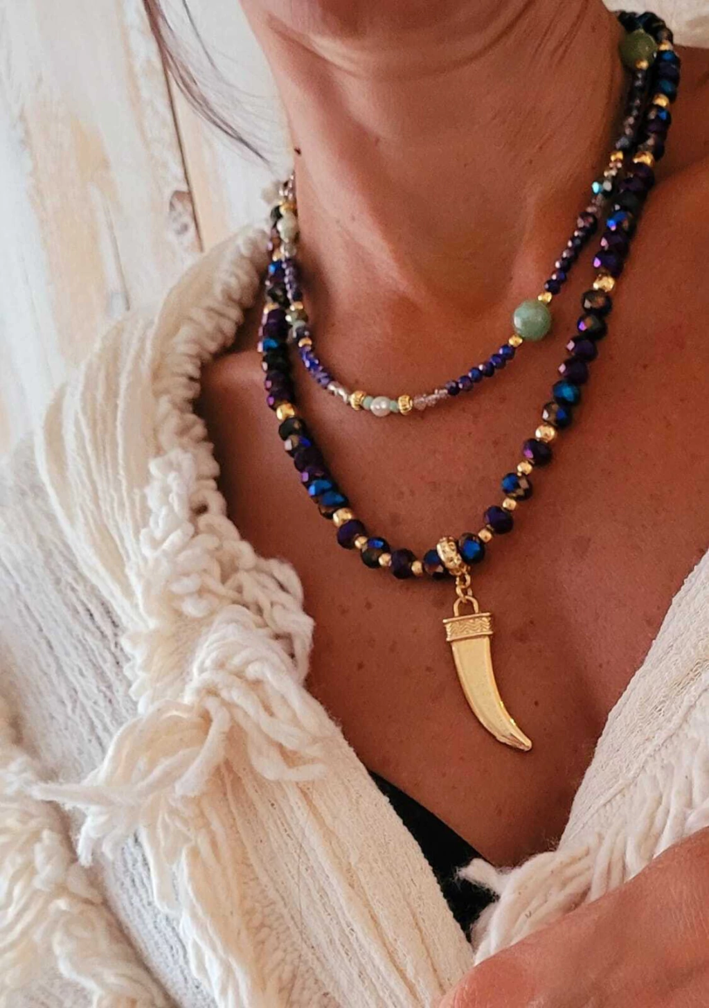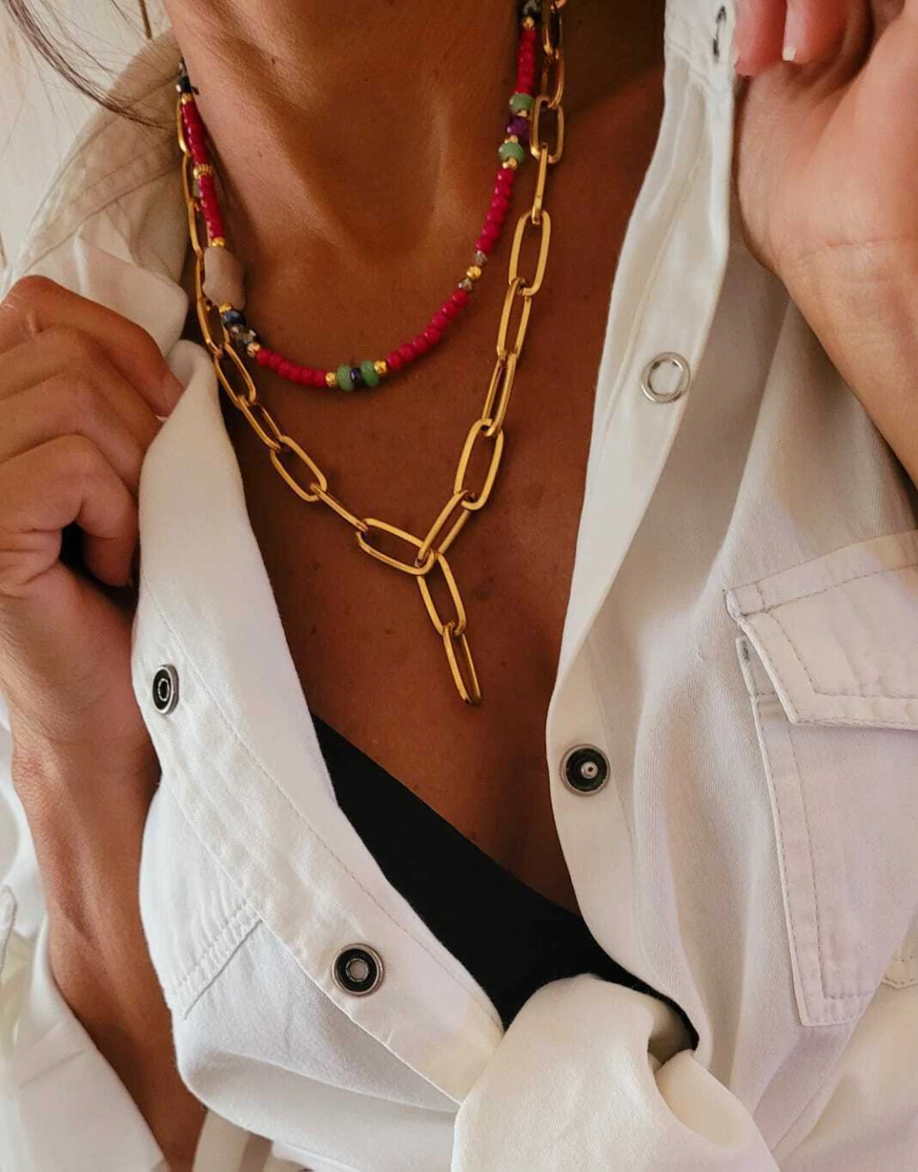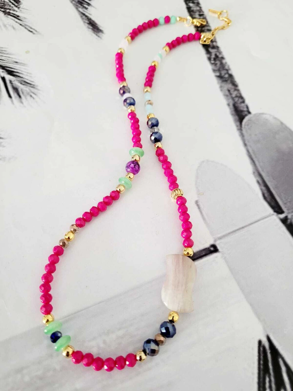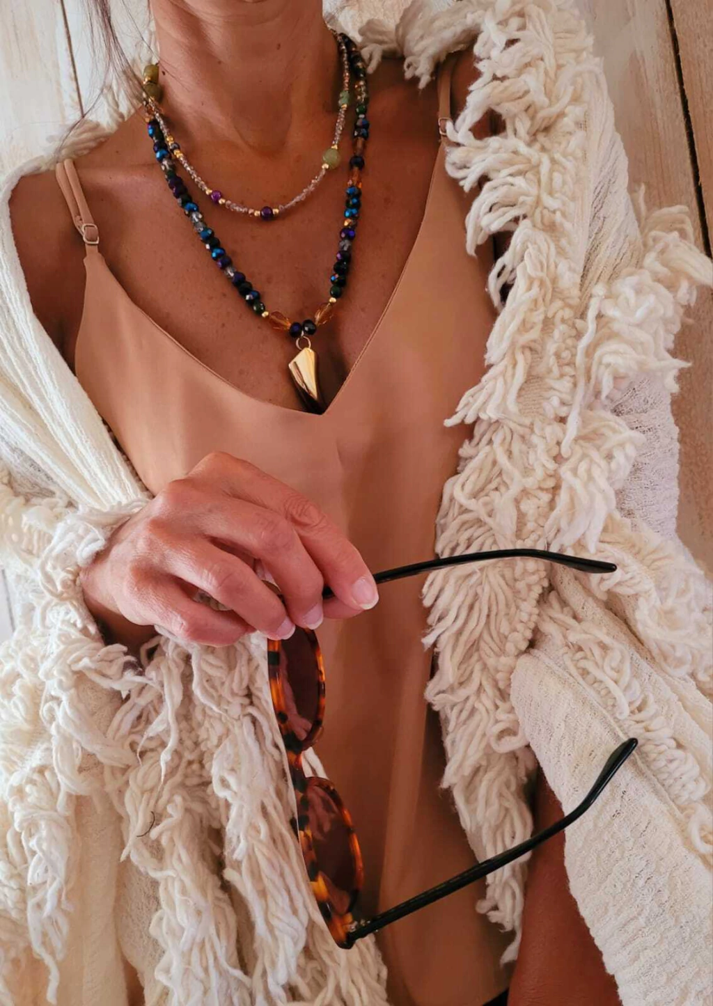 Collar realizado con piedras de cristal en diferentes tonos , cuarzo citrino y jade y detalles bañados en oro.