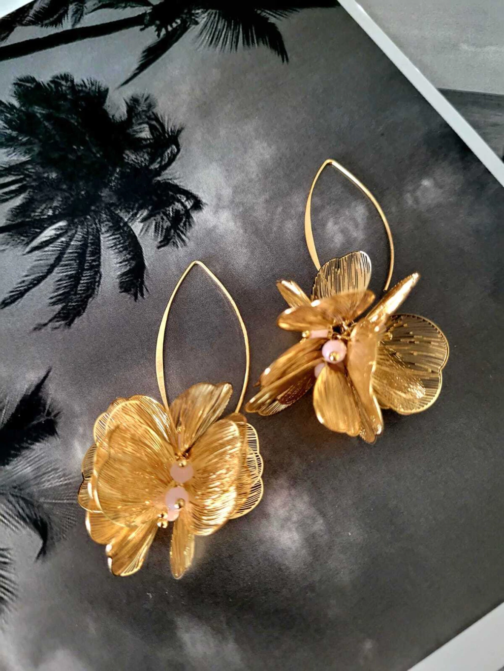 Aros colgantes de filagrana y detalles de cristales rosa.