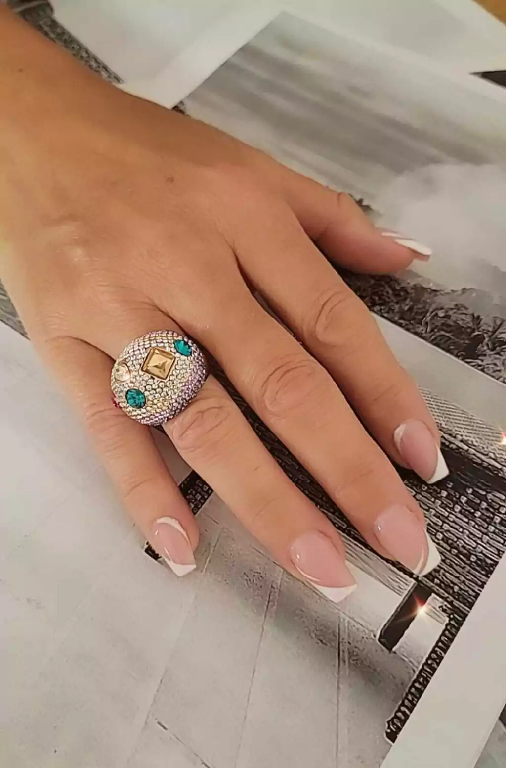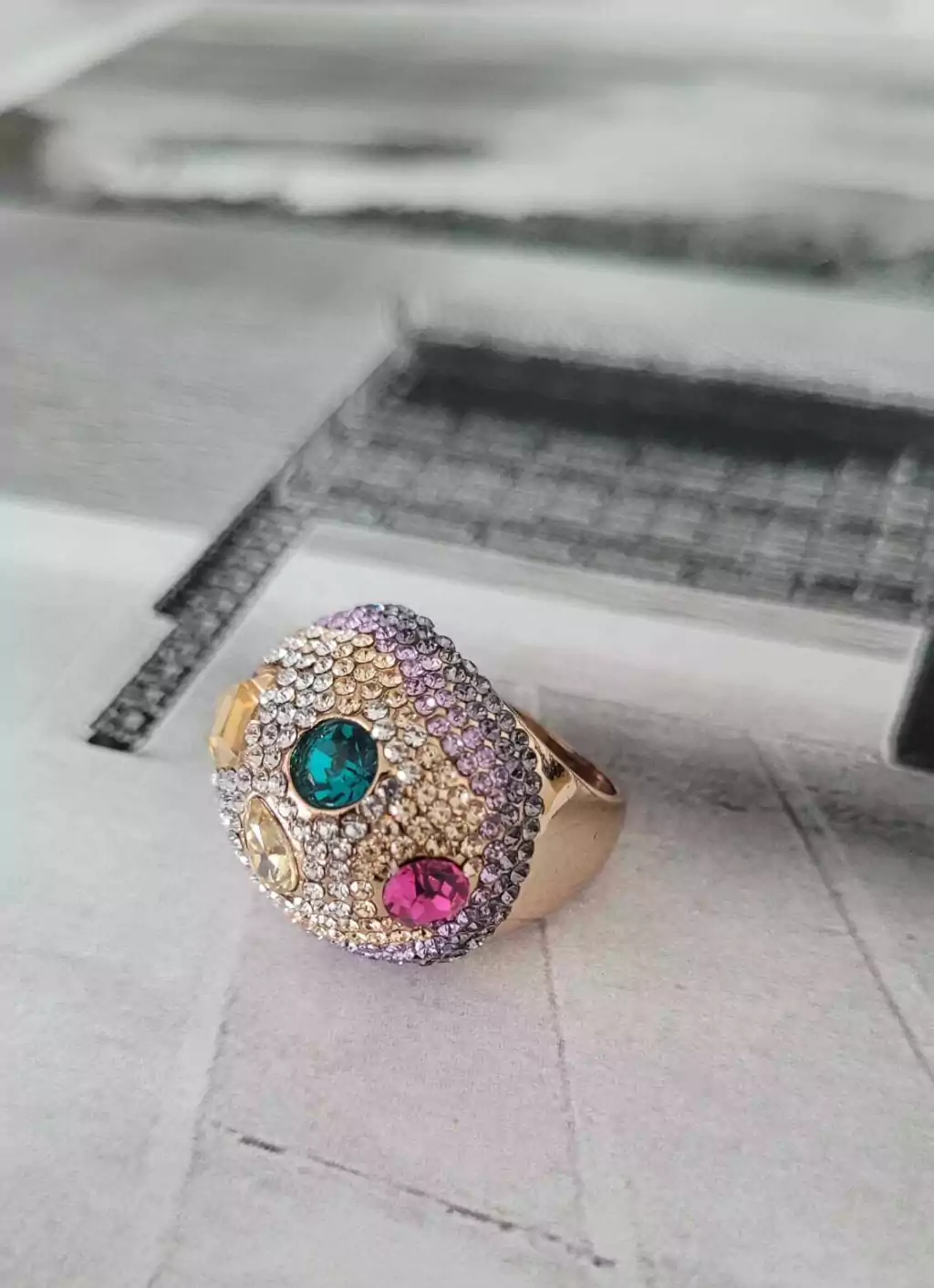 Anillo de base dorada con micro piedras y piedras en color lila, caramelo, cristal, fucsia y verde. Número 16 y 18 .