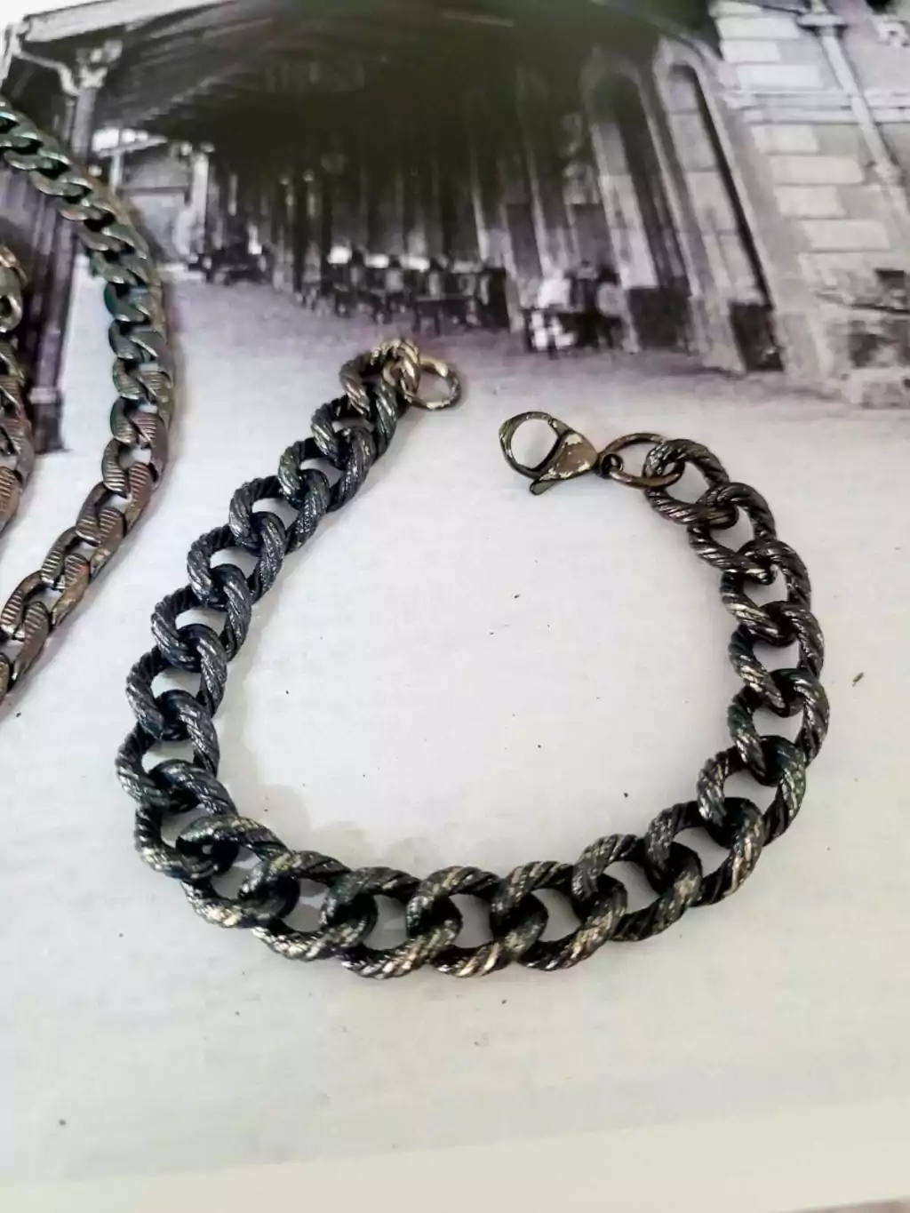 Pulsera de 0,8 cm de ancho, pavonada y laqueada, lo que hace que perdure el color.