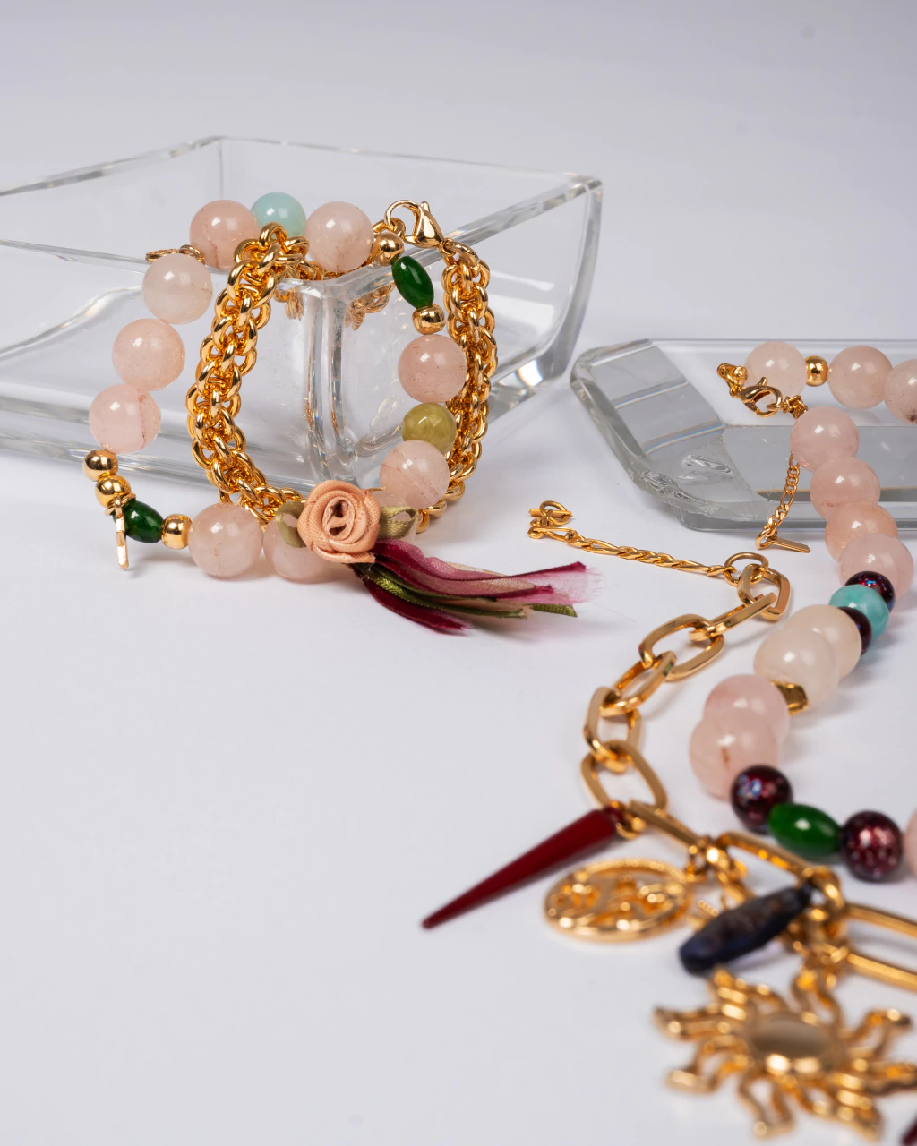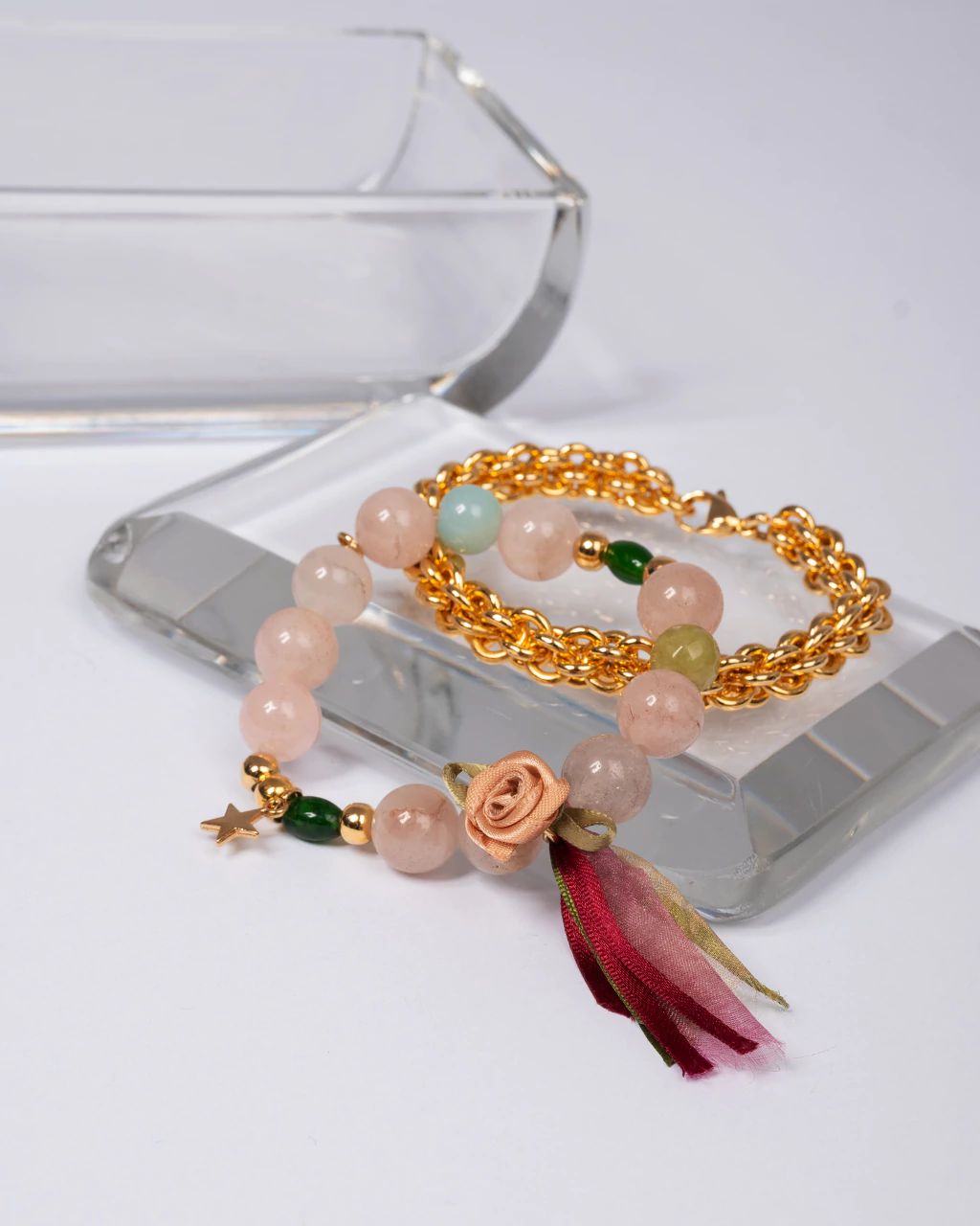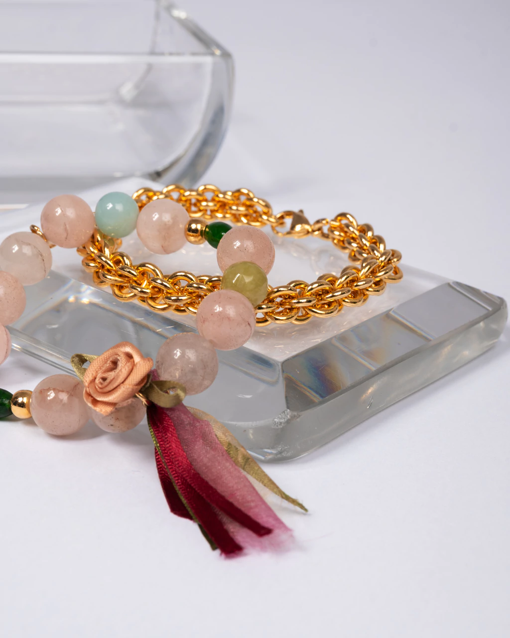 Set de pulseras bañada en oro 18 K, cuarzo rosa y verde y detalle de organza.