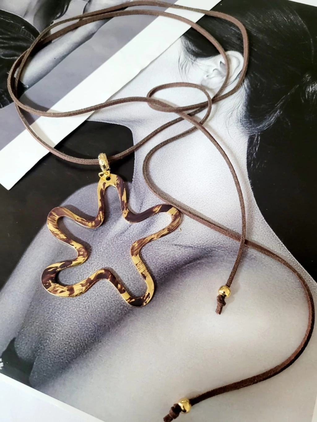Cordón de gamuza marrón con dije y terminaciones bañadas en oro . Dije con esmalte marrón.