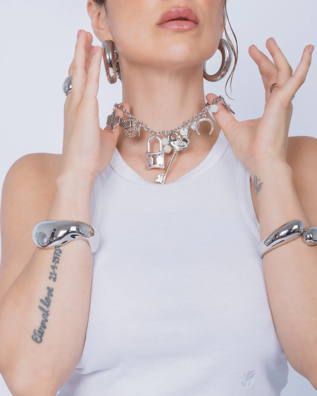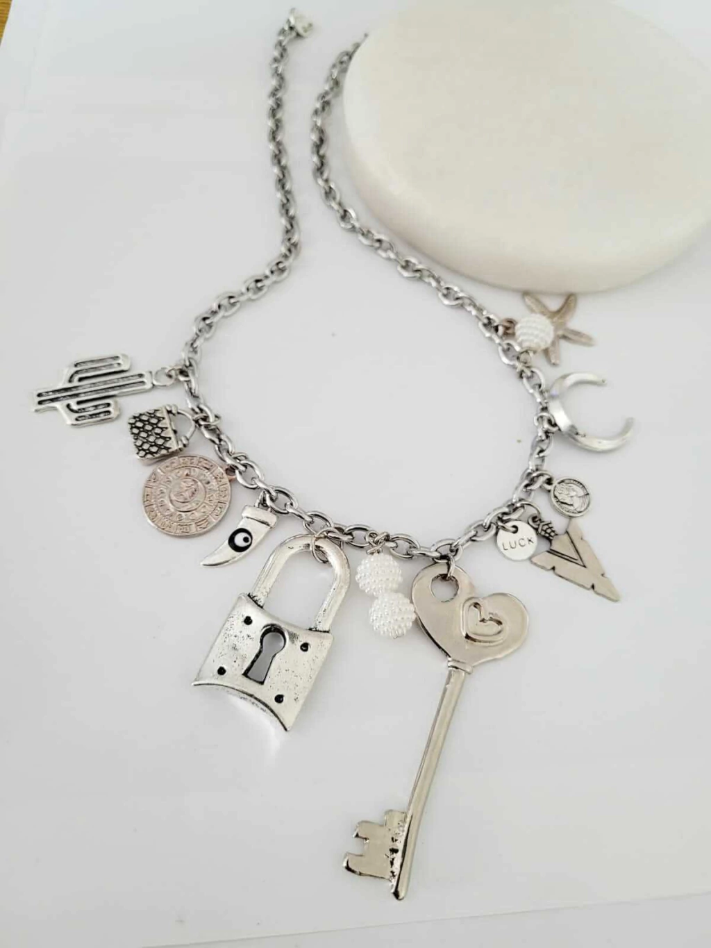 Cadena de acero con dijes en niquel wood y perla texturada.