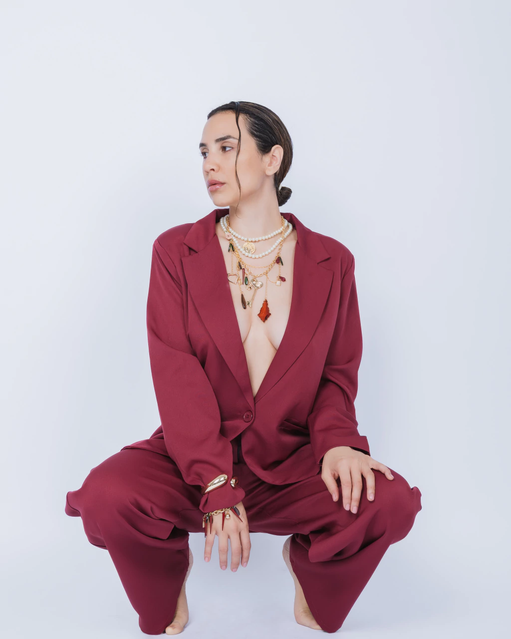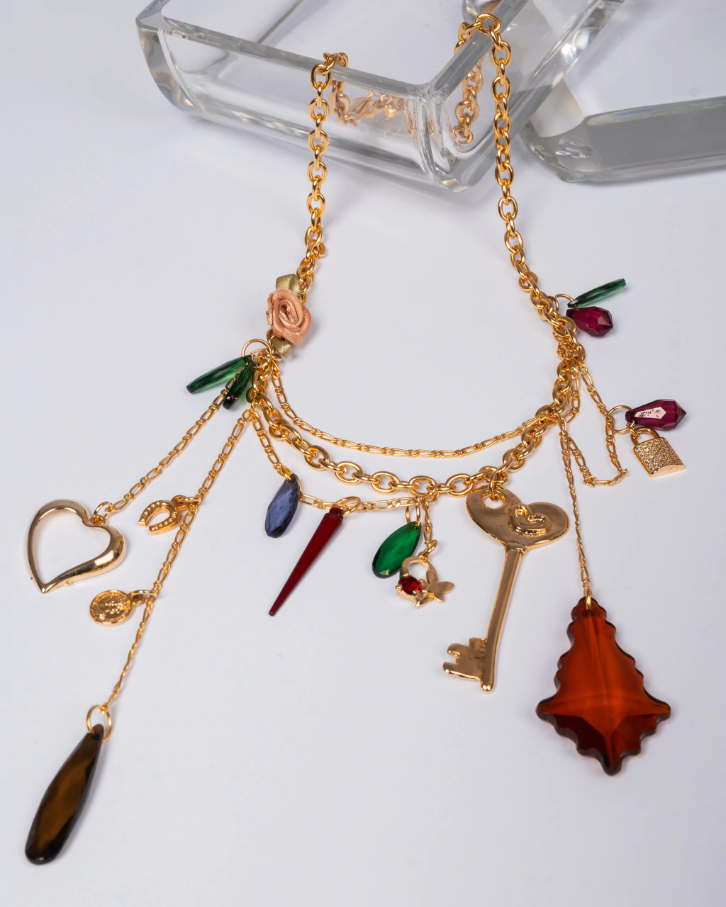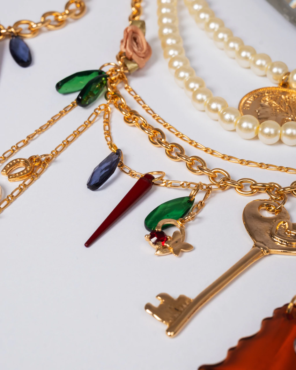 Cadena bañada en oro 18k , dijes de micropavé, resina y organza.