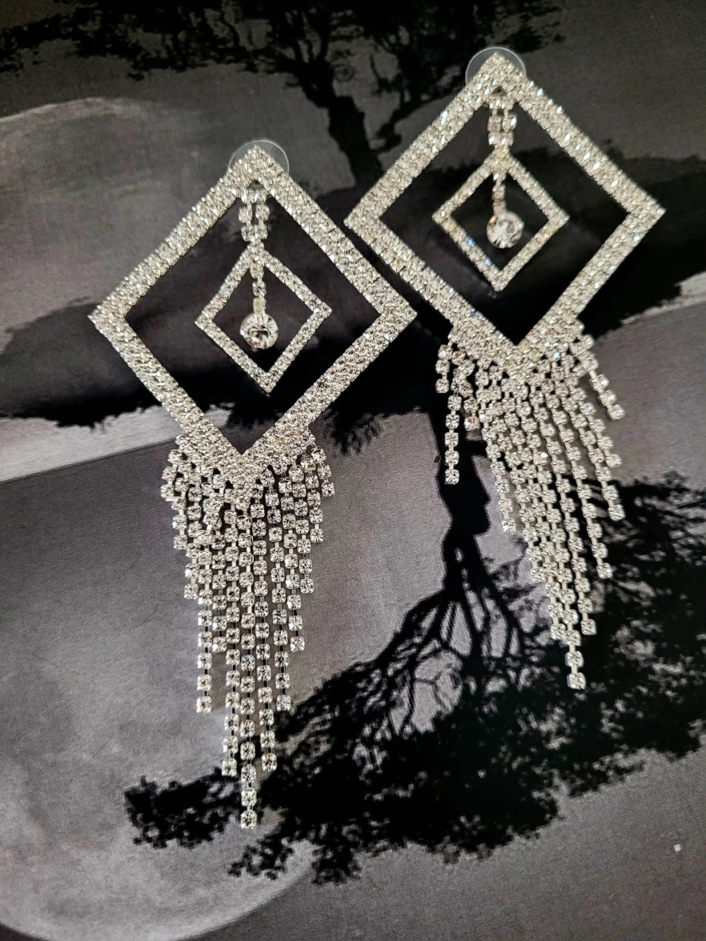 Aros de diseño con base plateada y strass. De 10 cm de largo y 5,5 cm de ancho.
