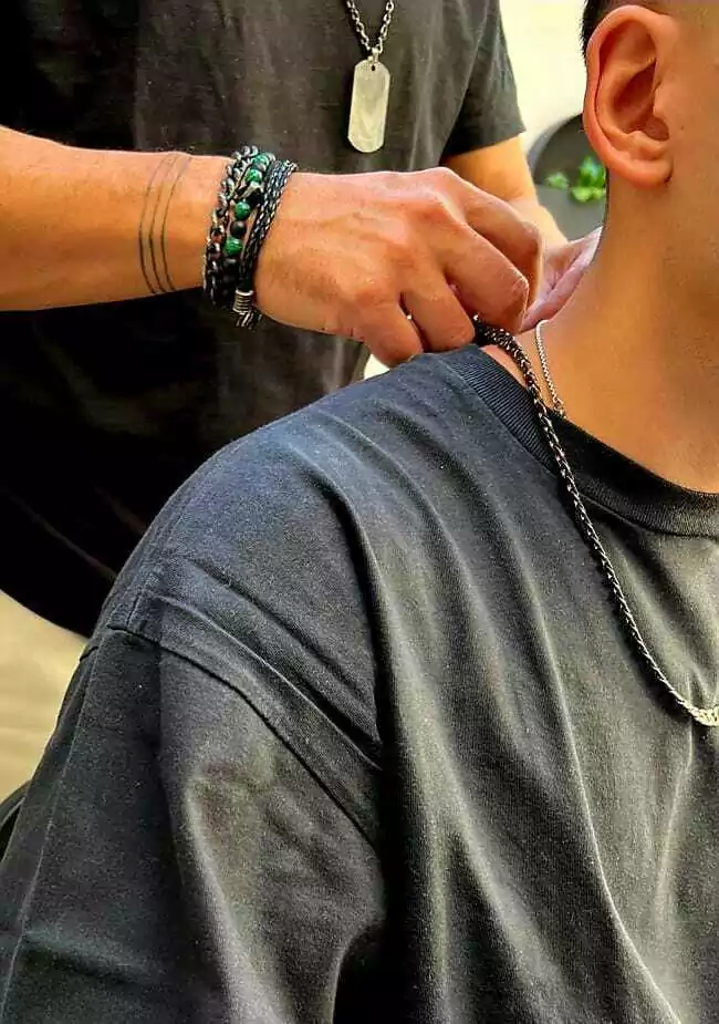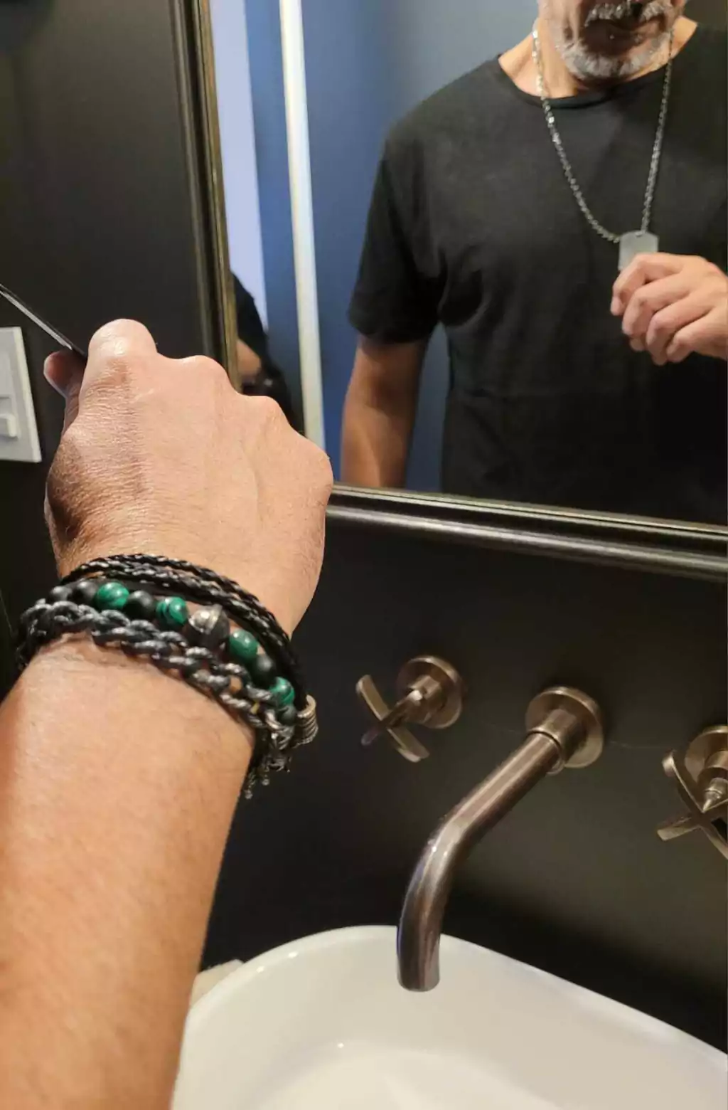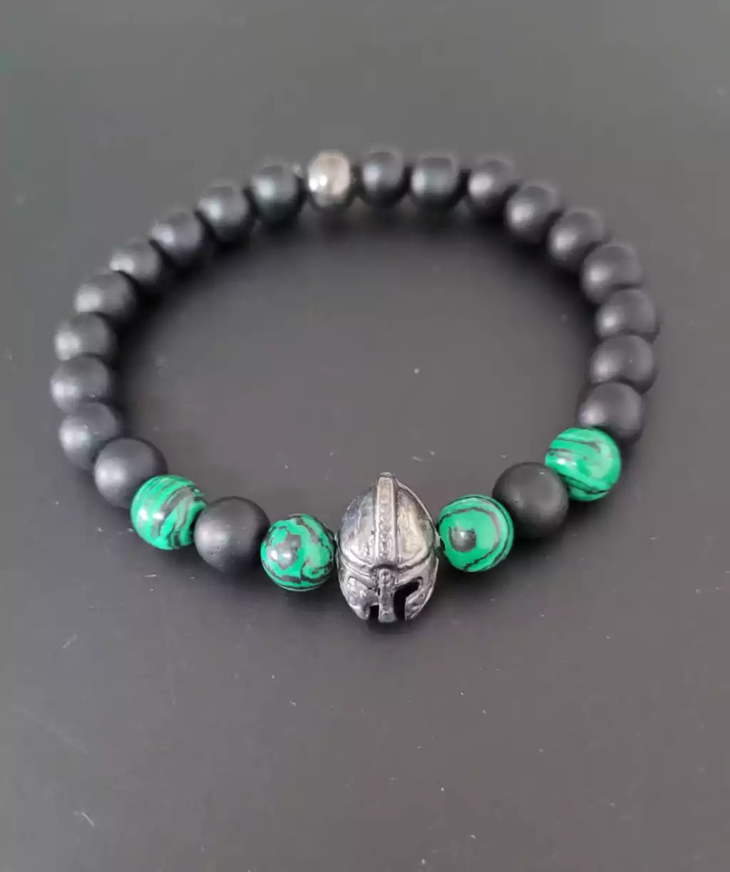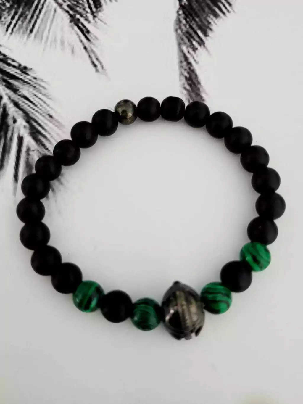 Pulsera realizada con Ónix mate, malaquita y dije pavonado.