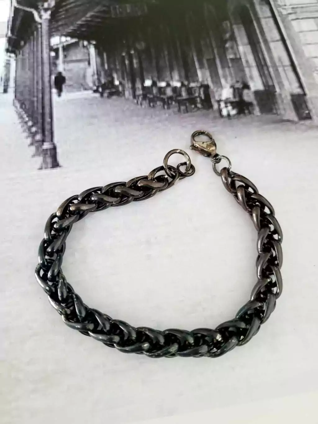 Pulsera tubular de 0,7 cm de ancho, pavonada y laqueada, lo que hace que perdure su color.